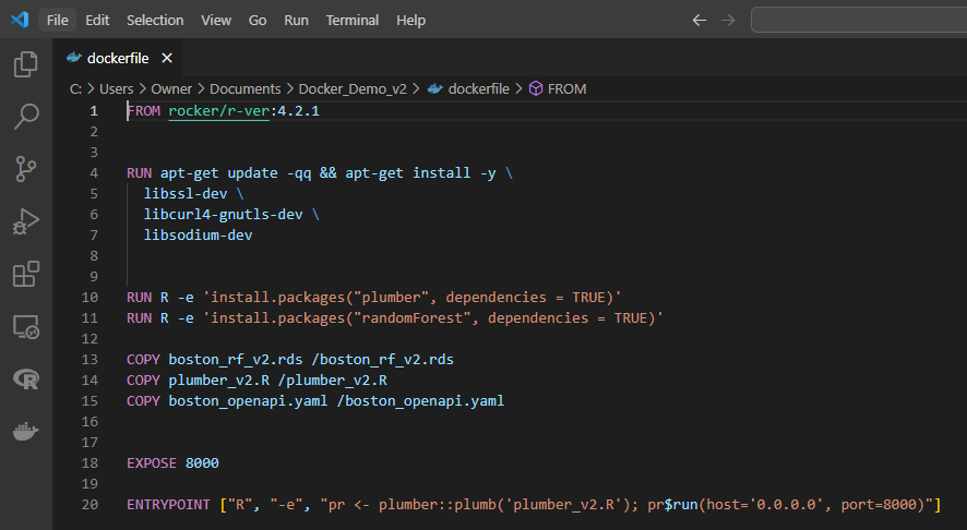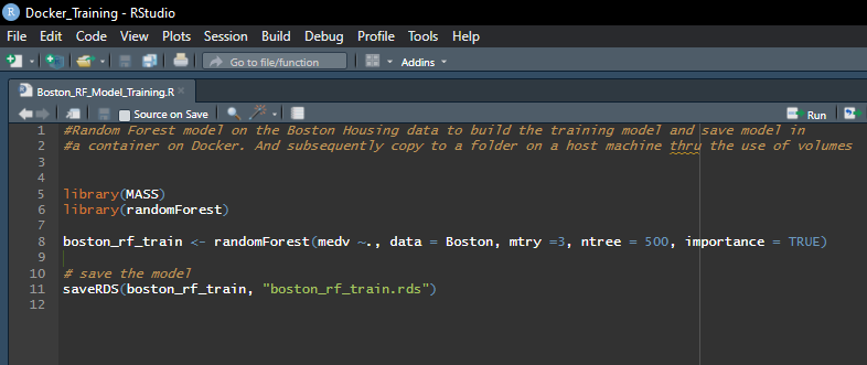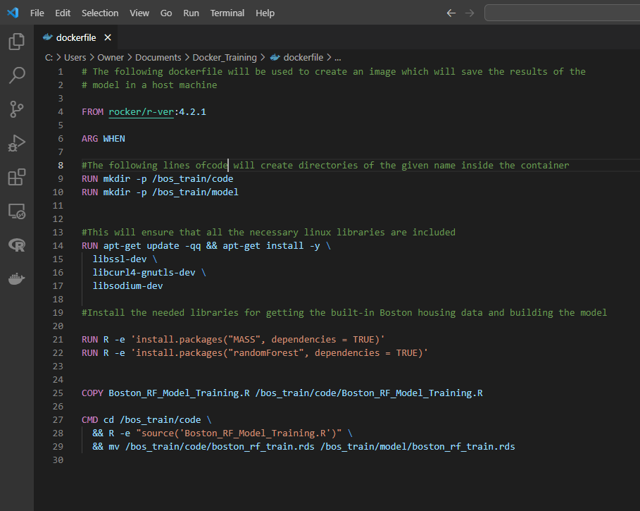 • The last few lines in the dockerfile instructs to change the working directory within the container to the one where the Rscript is located, RUN the Rscript therein and move the model generated to the directory - ‘bos_train/model’.