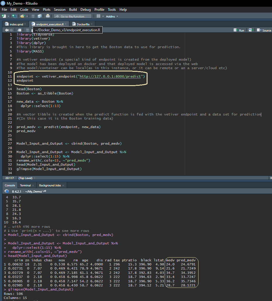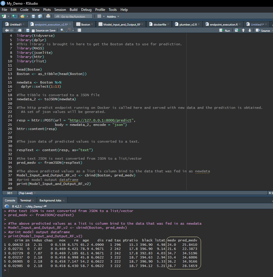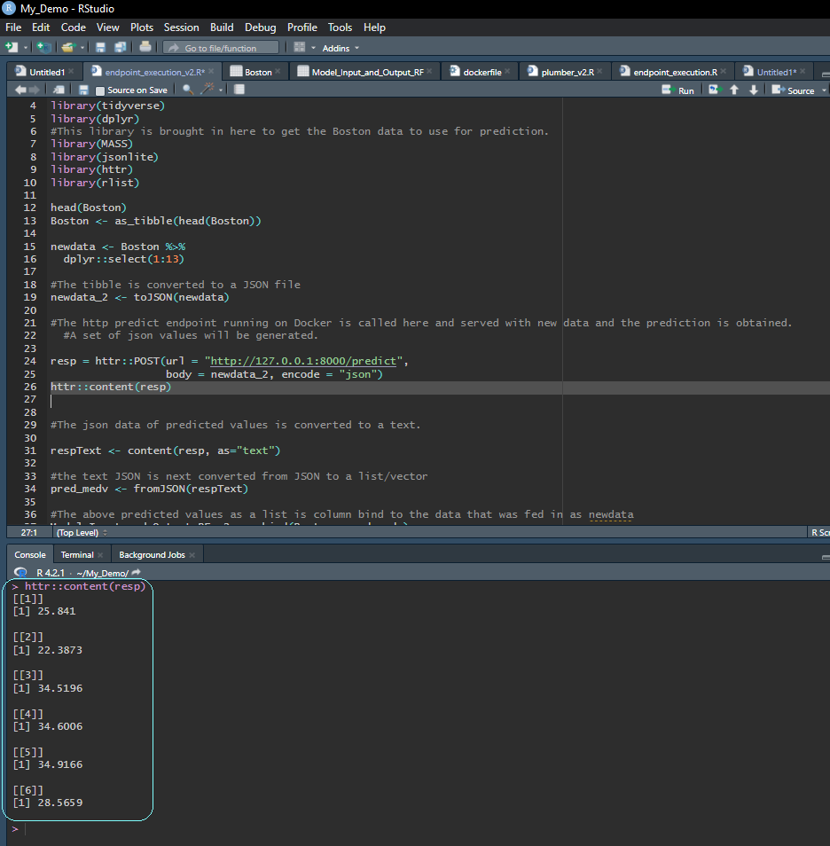 This is illustrated in Figure 16 where we come to a R terminal and pass a sample of the Boston Housing data-set to the vetiver endpoint and get predictions for multiple rows of predictor variables.
