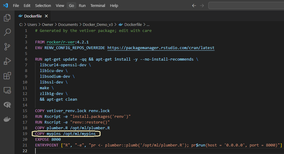 • Hence the Dockerfile is manually modified and the ‘mypins’ folder is added/copied to the vetiver generated dockerfile.