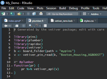 The Plumber and Dockerfile auto-generated by the vetiver Library are shown below. The auto-generated Dockerfile is modified by copying/adding the PINS folder. The addition/modification made is highlighted in the below dockerfile and the reasons for that is explained in the call-out box shown above.