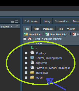 • Additionally, a new sub-folder is created within this project/working directory and named ‘model’. This sub-folder will receive the model generated within the container through the execution of volumes in our Docker commands.